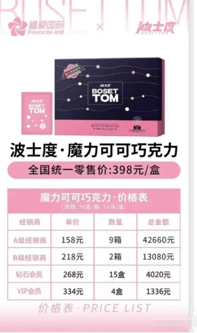 这与魔力可可的关系不可谓不紧密。在魔力可可巧克力、咖啡豆压片糖果等产品的生产委托方正是深圳市莱力兴贸易有限公司,该企业在经过更名之后又注销。那么,魔力可可到底是不是涉嫌传销呢?多层级销售的模式,并且涉及到不同层级的门槛费不同。在成为魔力可可的代理后,通过拉人加入也可以获利。