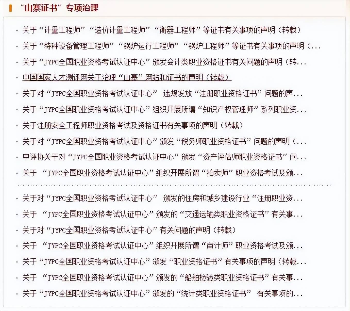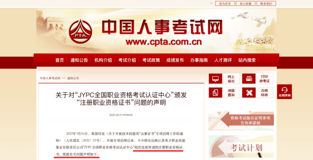不过,这些行为已被官方认定违规。上述人社部人事考试中心声明已明确,“JYPC全国职业资格考试认证中心”颁发的所谓注册职业资格证书,使用了“全国”“职业资格”字样和国徽标志,违反了国家有关规定。