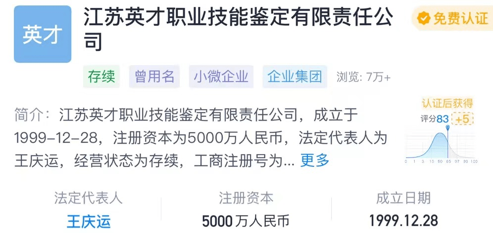 据了解,英才公司对外宣称是国内创办最早、规模最大的第三方认证机构。英才公司法定代表人王庆运称,公司每年都会去市场监管部门备案,而申领的营业执照“一般经营项目”含有职业技能鉴定,没有“许可经营项目”,因而无需向人社部门备案。