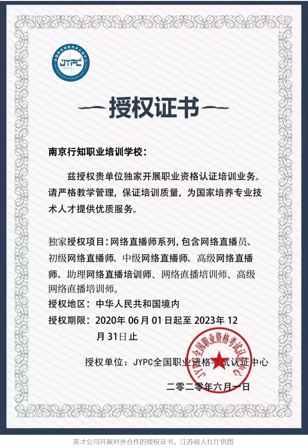 近期,人力资源和社会保障部职业技能鉴定中心、人事考试中心等机构发布声明称,接群众举报反映英才公司以“JYPC全国职业资格考试认证中心”名义颁发“注册职业资格证书”,而该公司及其认证中心并未在行业主管部门备案,颁发的证书不属于国家认可的职业资格证书。