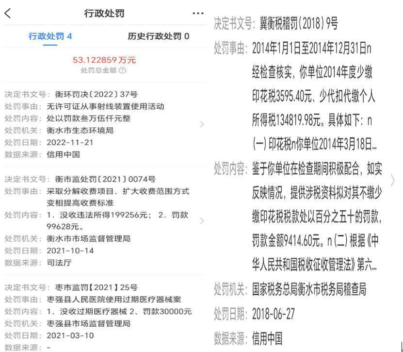 天眼查显示:枣强县人民医院累计被行政处罚4次,处罚总金额达53.122859万元。