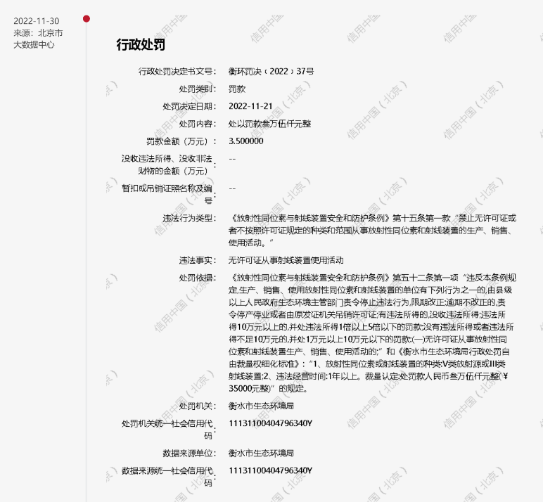 据《信用中国》公开信息显示:2022年11月21日,衡水市生态环境局以无许可证从事射线装置使用活动为由对河北省枣强县人民医院罚款3.5万元。