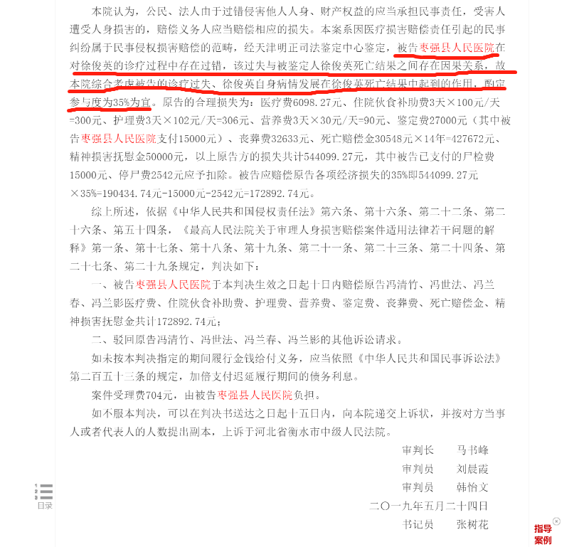 枣强县人民法院认为,公民、法人由于过错侵害他人人身、财产权益的应当承担民事责任,受害人遭受人身损害的,赔偿义务人应当赔偿相应的损失。本案系因医疗损害赔偿责任引起的民事纠纷属于民事侵权损害赔偿的范畴,经天津明正司法鉴定中心鉴定,被告枣强县人民医院在对徐俊英的诊疗过程中存在过错,该过失与被鉴定人徐俊英死亡结果之间存在因果关系,故本院综合考虑被告的诊疗过失、徐俊英自身病情发展在徐俊英死亡结果中起到的作用,酌定参与度为35%为宜。