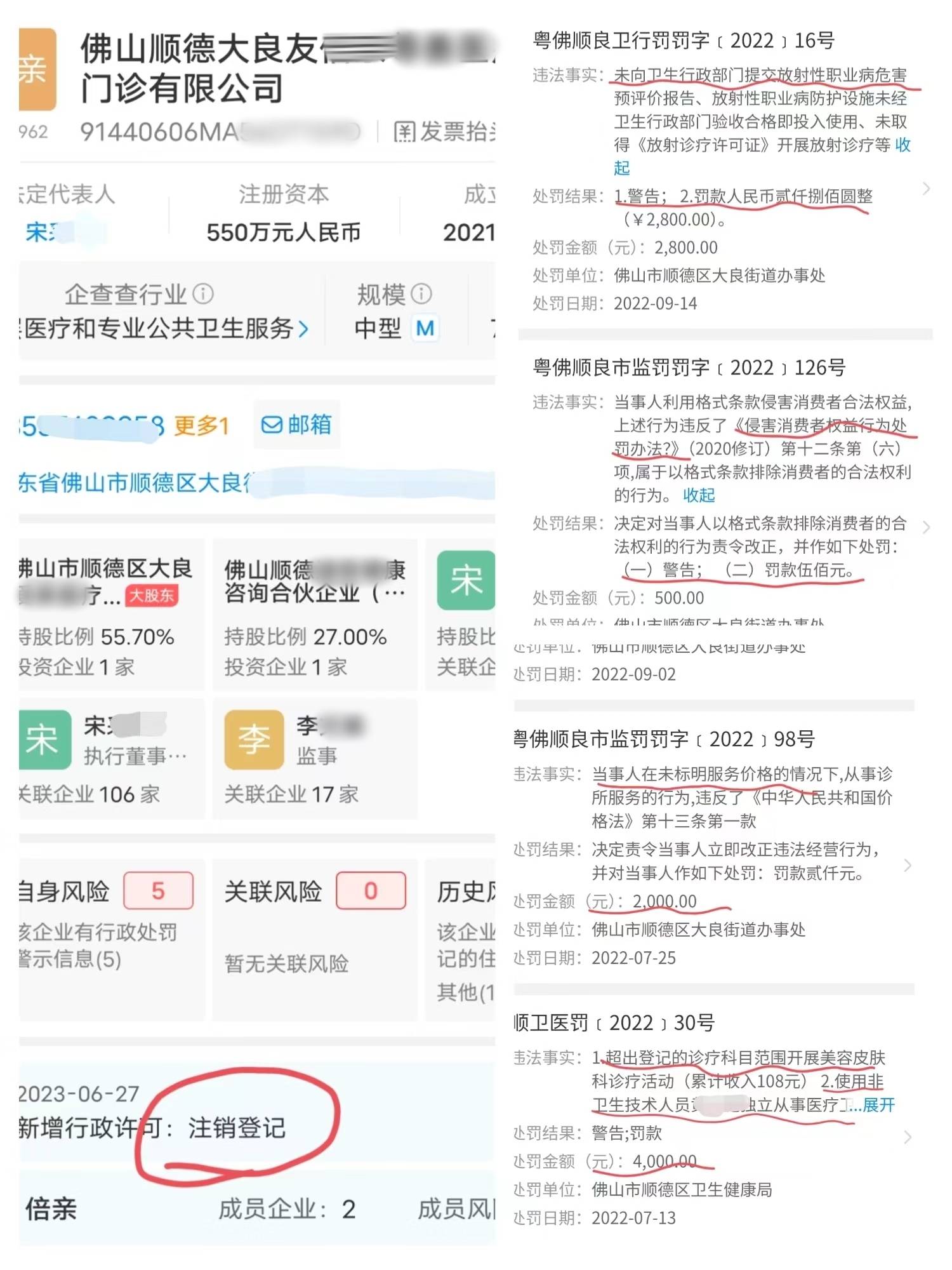 而由“宋某”作为院长的“佛山顺德大良友某亲某某医疗门诊有限公司”更是多次因“为取得放射诊疗许可证开展诊疗”、“侵害消费者合法权益”、“未标明服务价格开展服务”、“超出登记开展美容皮肤诊疗”“使用非卫生技术人员”等多项问题,被行政处罚,没收违法所得。