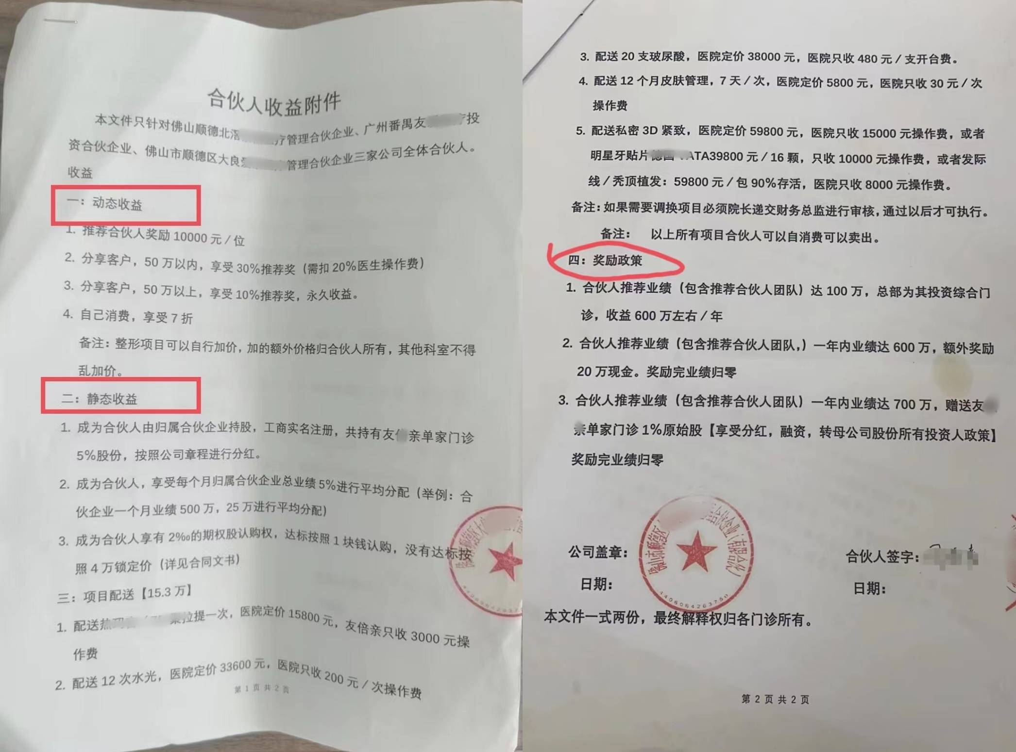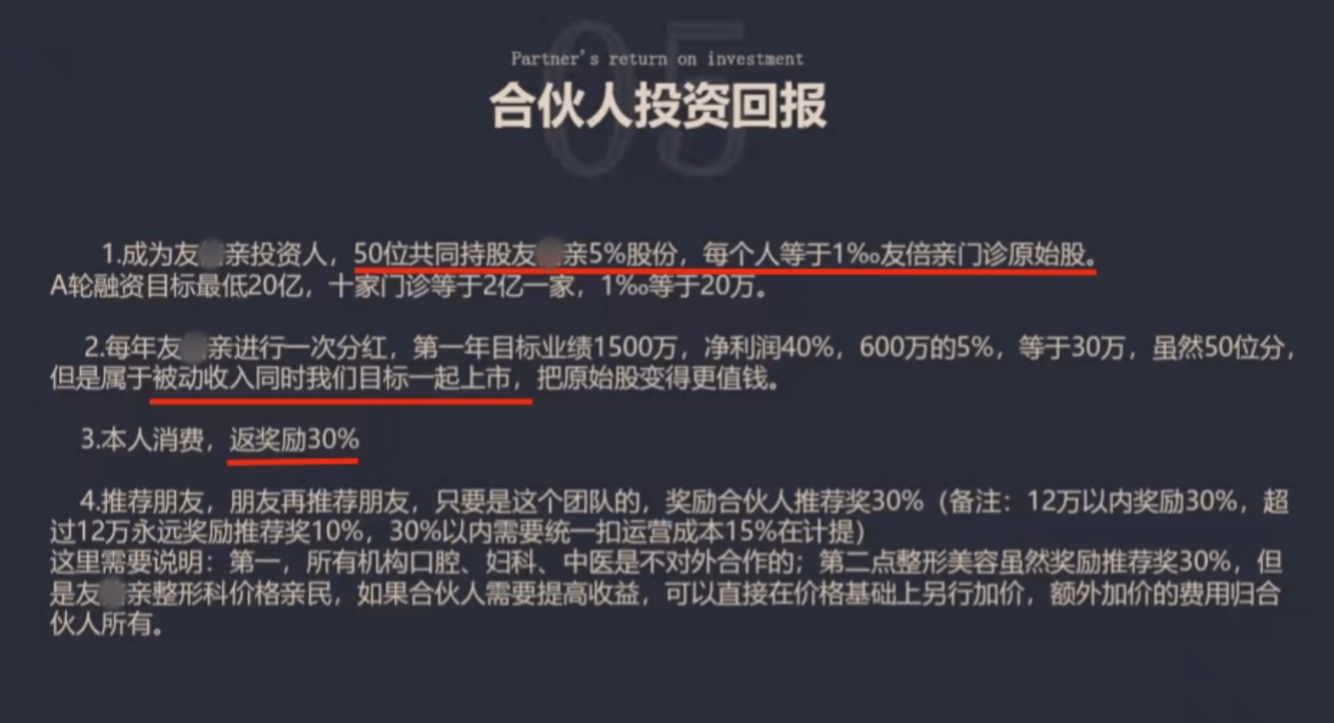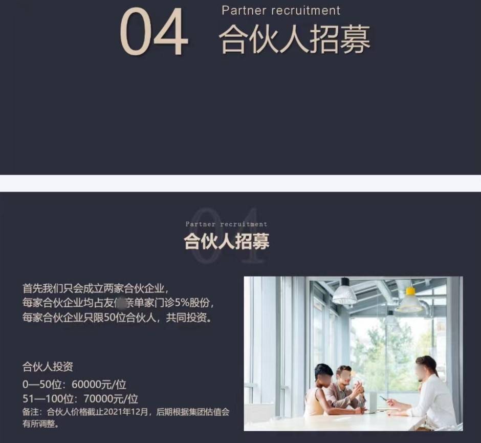 “友某亲”称,目前已经成功开设的诊所仅月收入就可达到十几万元,上市之后的收益更是不可估量。为了调动投资者积极性,“友某亲”表示目前公司只成立两家合伙企业,每家只招募50名合伙人,交纳6万元即可每月稳赚30万。