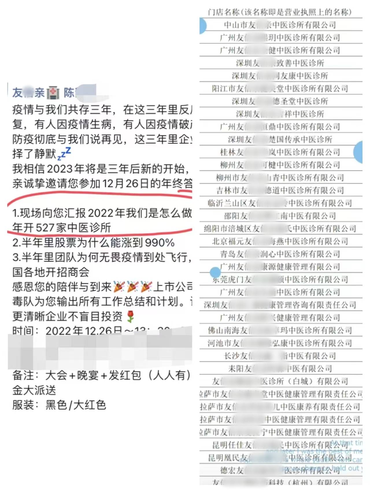 不仅如此,“陈某”一直对外宣称仅2022年一年“友某亲”就已开设527家中医诊所,但根据资料显示,目前友某亲线下收购开设的门店仅有不到百家。