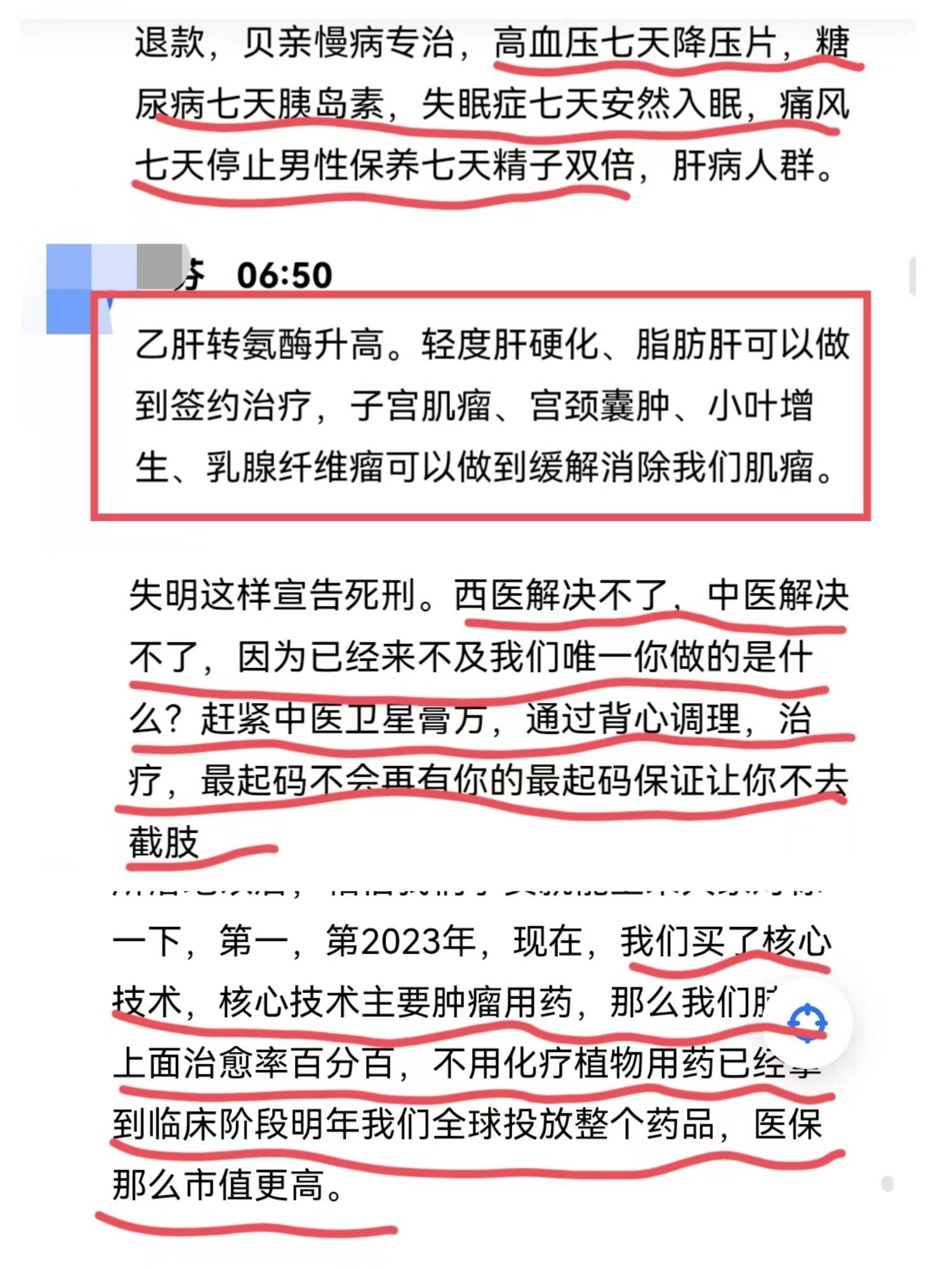 并宣称公司所有产品药食同源,无任何副作用,可以做到慢病专治。并宣称可以七天降血压、三个月治疗糖尿病,七天治疗失眠、痛风等多种疾病,并能够做到不手术直接消除各种肌瘤。甚至还表示,集团已经购买了肿瘤用药的核心技术,不用化疗就可以使肿瘤达到百分百治愈率的植物药品已经进入临床阶段,明年即可全球投放市场。