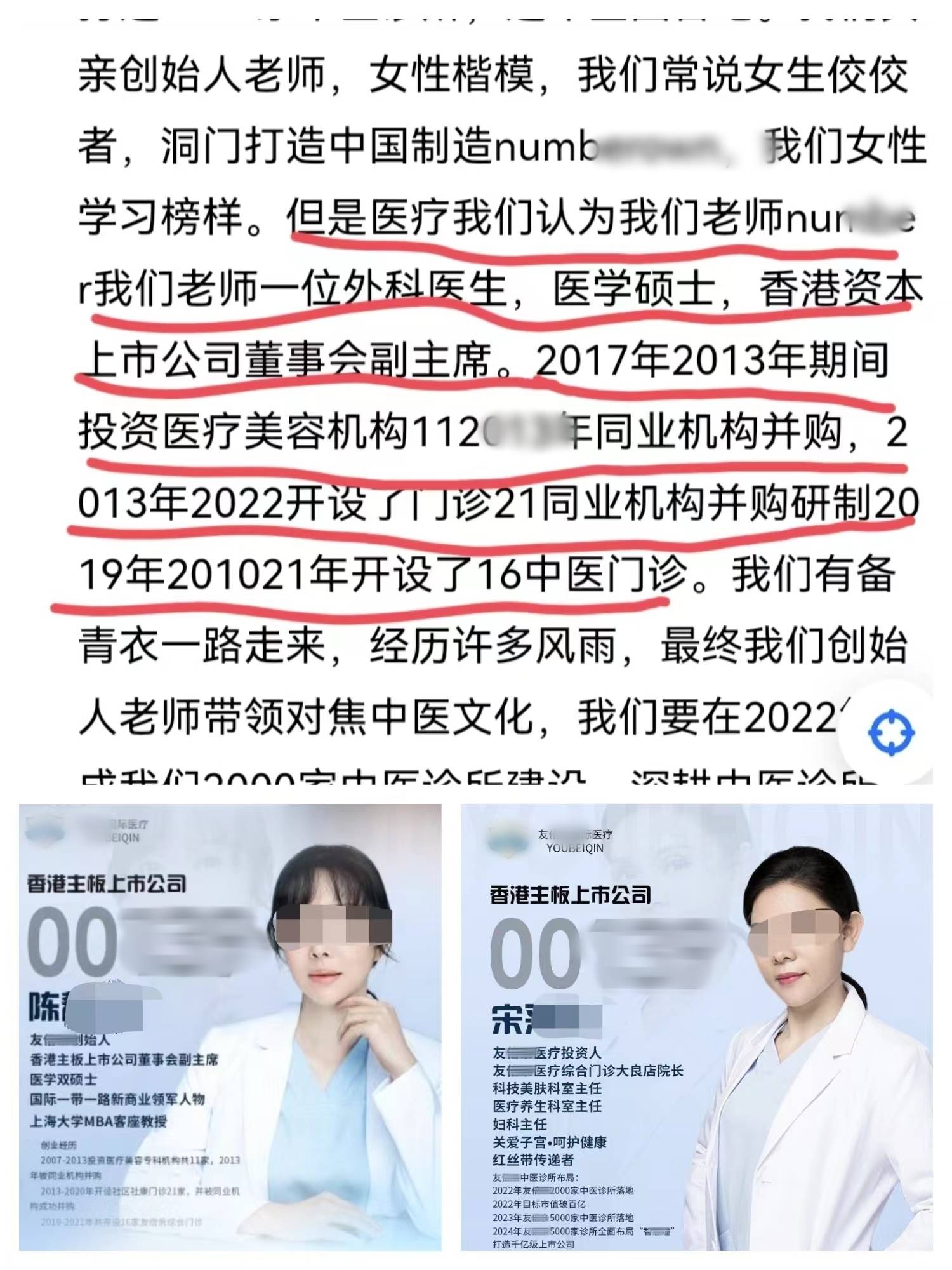 其次,“友某亲”的创始人陈某一直宣称自己是医学双博士,06年自日本留学归来后便开始行医,堪称医学界奇才。公司法人宋某作为大良店的院长,也同时担任“友某亲”科技肤美、医疗养生和妇科三个科室的主任职位。