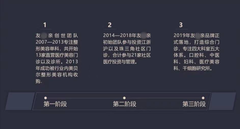 在 “友某亲”视频会议中,创始人“陈某”表示,“友某亲”是一家综合门诊,设立口腔科、中医科、妇科、医疗美容科以及干细胞研究所等四大科室五大体系。