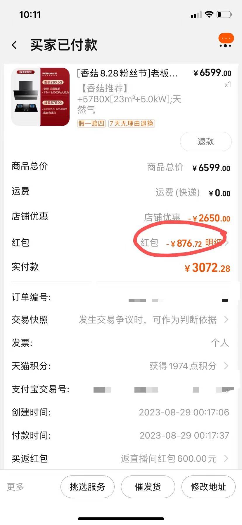 李女士告诉记者,嘉年华活动期间还购买了厨房电器,使用了876.72元的买返红包,最终实付3072元,另外还返了直播红包600元。但如今,李女士想要取消这笔订单显得十分被动。“现在拖着不敢退,怕再扣我钱。如果要退款,可能直接退给我3072-600=2472元,然后返给我876.72元的红包已经失效不能用了。”