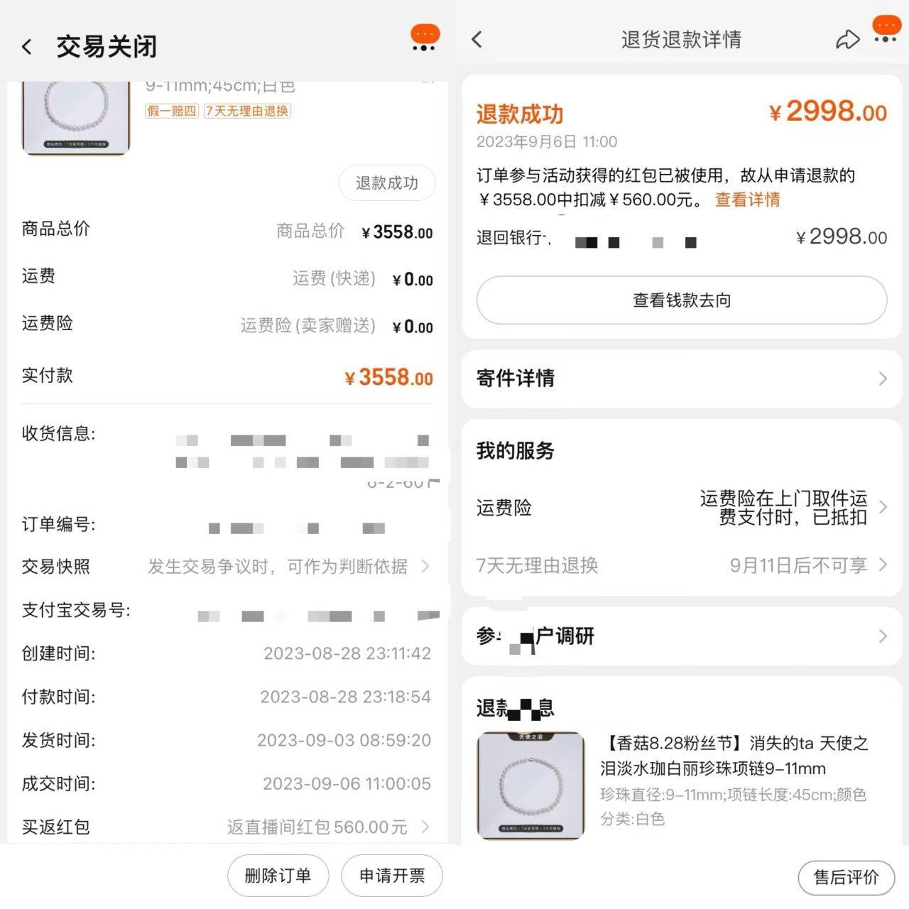 来自江苏南京的李女士告诉消费者报道记者,在粉丝嘉年华活动期间,她通过香菇来了直播间下单购买了一条珍珠项链,“实付3558元,说是返560元的红包。收到货后妈妈不喜欢,我申请了退款,结果只到款2998元。”