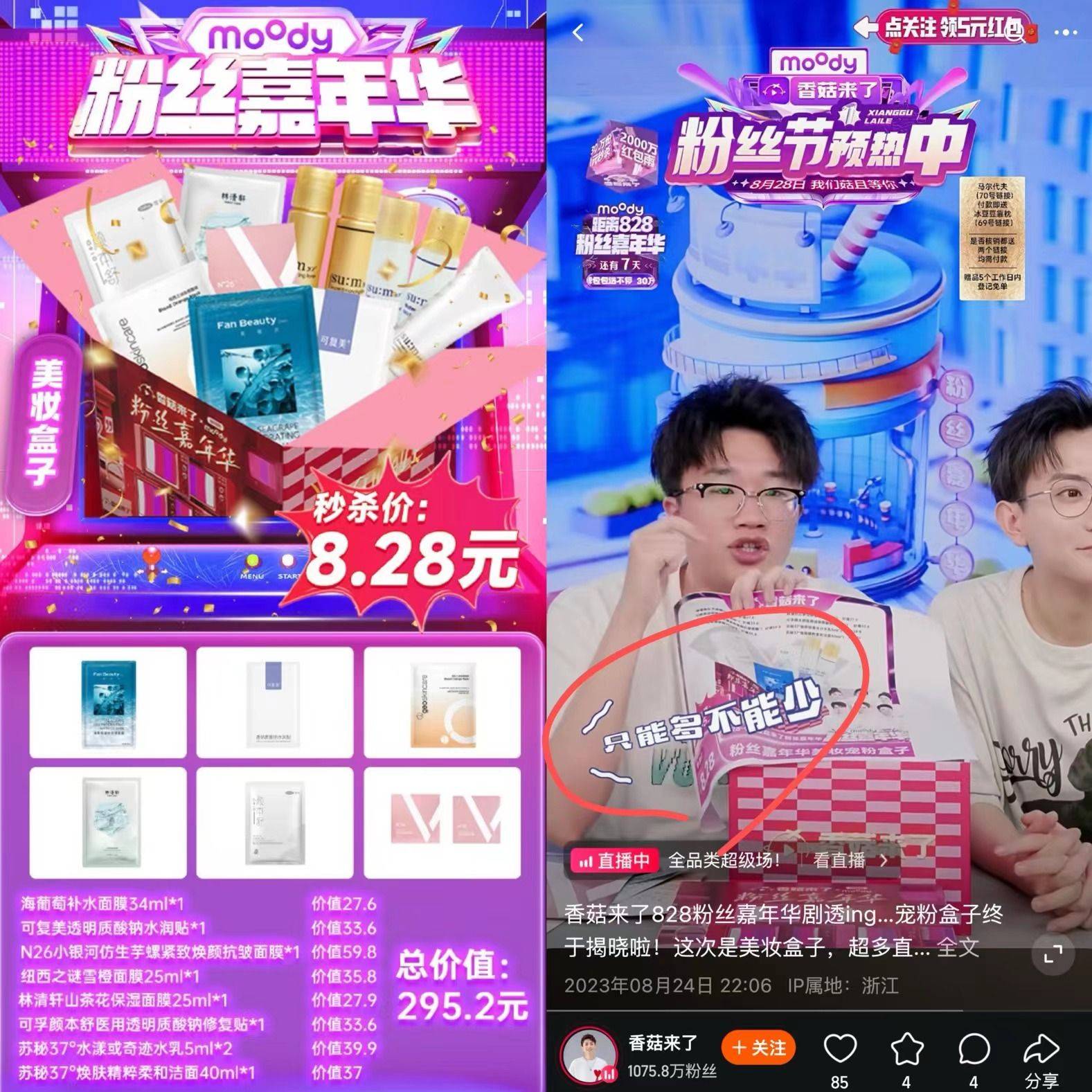 在此期间,香菇来了直播间推出一系列的宠粉盒子,包括美妆盒子、生活盒子、健康盒子,一盒产品宣称价值228元-295元不等,均直播售价8.28元一盒。