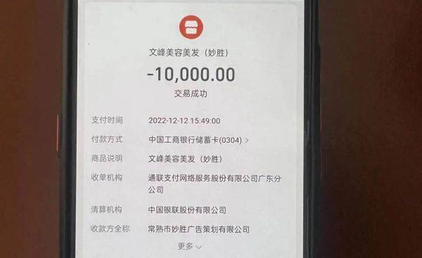 任阿姨还指出,哥哥转账的收款方显示为“常熟市妙胜广告策划有限公司”,仅在商品说明处标注“文峰美容美发(妙胜)”。明明在文峰消费,为何收款方却是外地的广告公司?这其中是不是又暗藏猫腻?