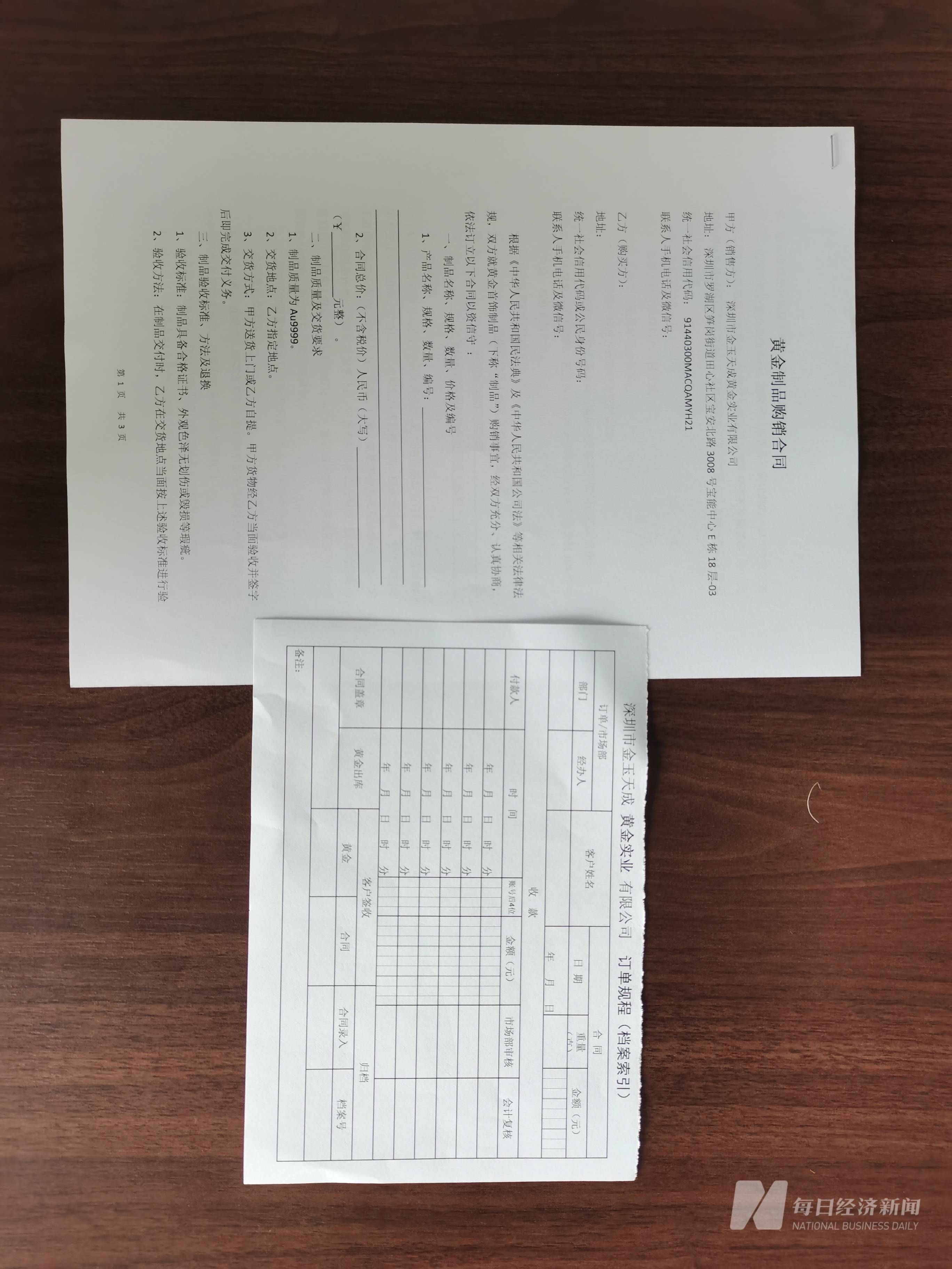 据何晓琴所述,金玉汇萃公司首先会以下属的深圳市金玉天成黄金制品有限公司名义,与投资者签订《黄金制品购销合同》,主要内容为购买黄金首饰,并约定了黄金重量、价格和交接方式。以一份8月签署的合同来看,购买500克黄金需要28.75万元,平均每克售价575元,而彼时的黄金现货价格约为450元一克。但值得注意的是,记者从获得的多份合同、收据来看,消费者实际需要支付的金额,仅为合同标注价格的约20%。