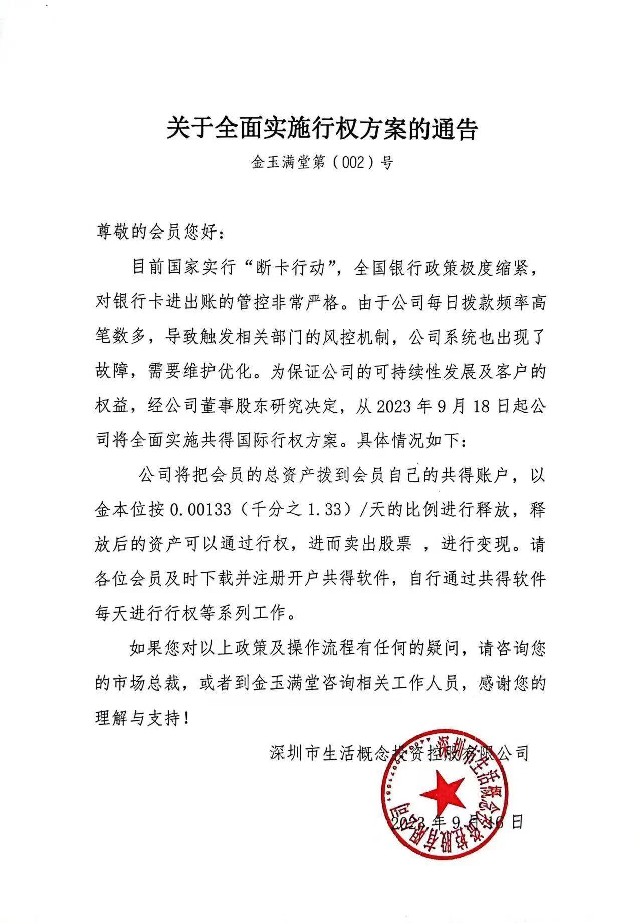 金玉汇萃公司方面发出的通知 图片来源:受访者提供