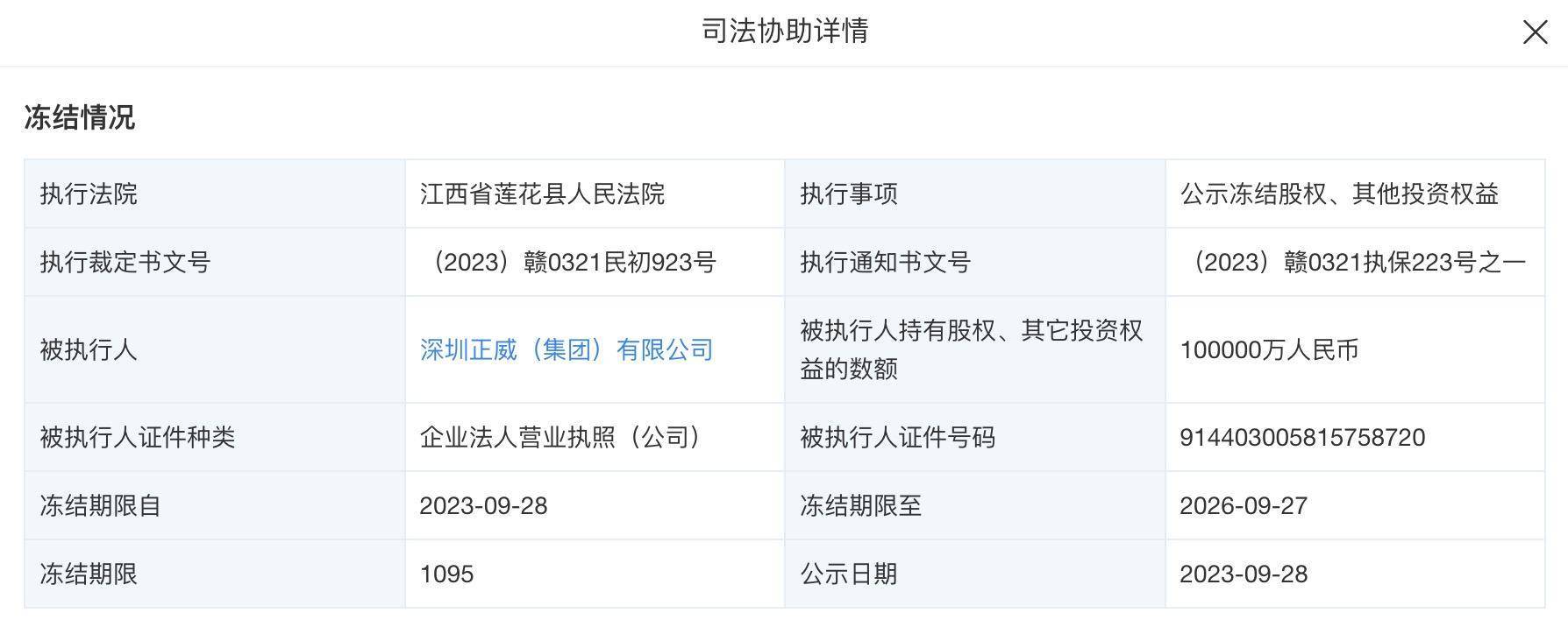 10月18日,南都湾财社记者获悉,天眼查显示,正威集团近日新增一则股权冻结信息,冻结股权数额10亿元,冻结期限自2023年9月28日至2026年9月27日。冻结股权标的企业为其全资子公司河北中铜矿业有限公司,执行法院为江西省莲花县人民法院。