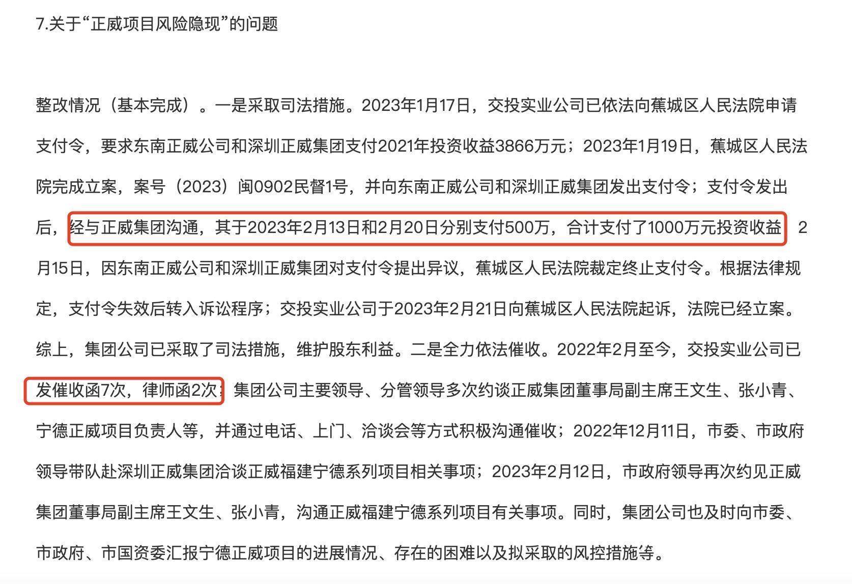 2023年1月19日,蕉城区人民法院完成立案,并向正威东南和正威集团发出支付令;支付令发出后,经与正威集团沟通,其于2023年2月13日和2月20日分别支付500万,合计支付了1000万元投资收益。