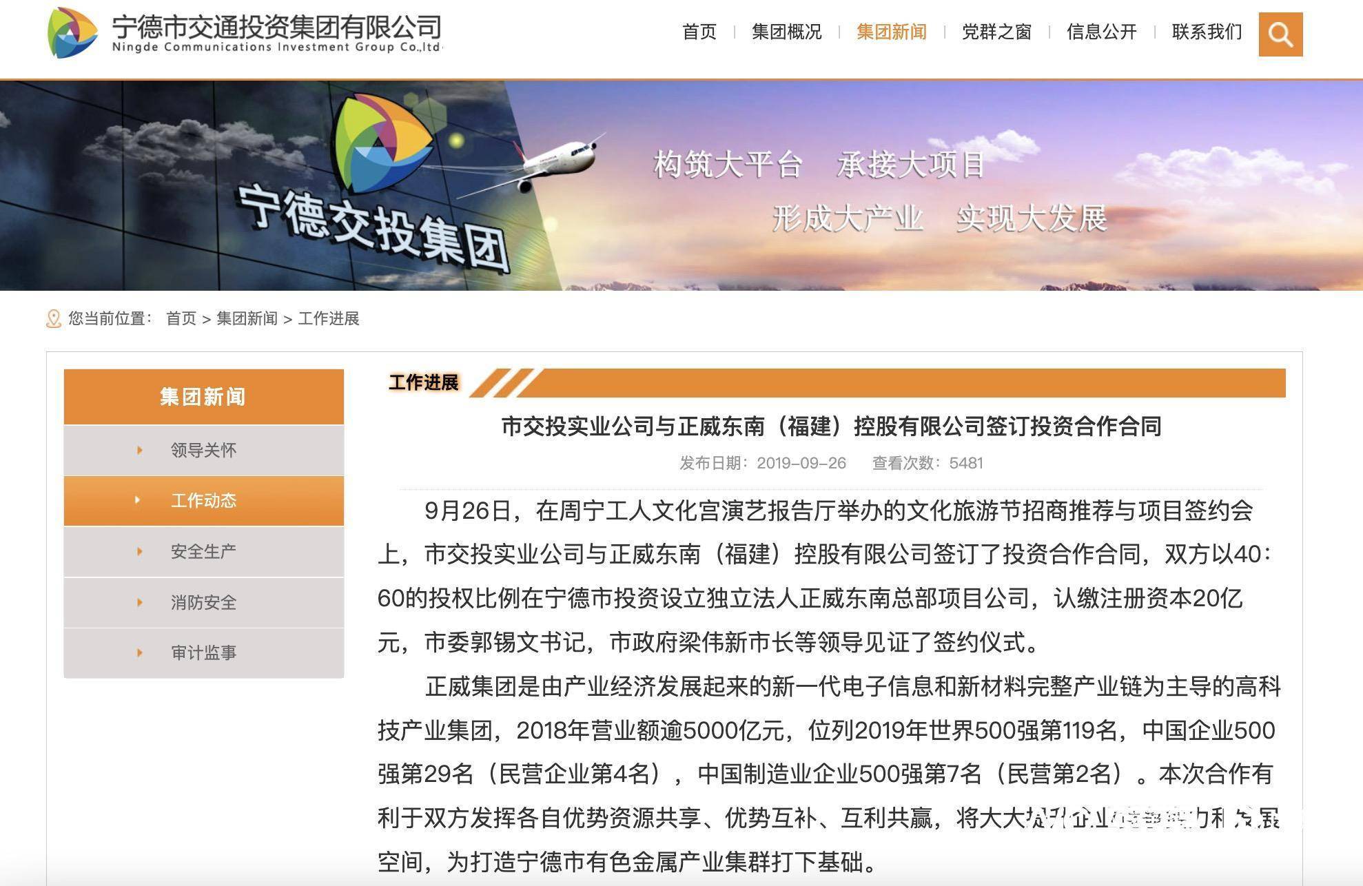 双方的合作要追溯到2019年。据公开信息,2019年9月,宁德交投集团与正威东南签订了投资合作合同,双方以40:60的投权比例在宁德市投资设立独立法人正威东南总部项目公司,认缴注册资本20亿元。彼时,宁德交投集团对此寄予厚望,认为这一合作“为打造宁德市有色金属产业集群打下基础”。