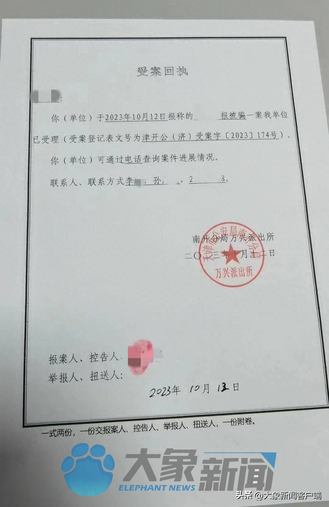 北京的张庆夫妇是第一批赶到天津维权的受害者,也是第一个到天津市南开区万兴派出所做笔录,并收到受案回执的人。