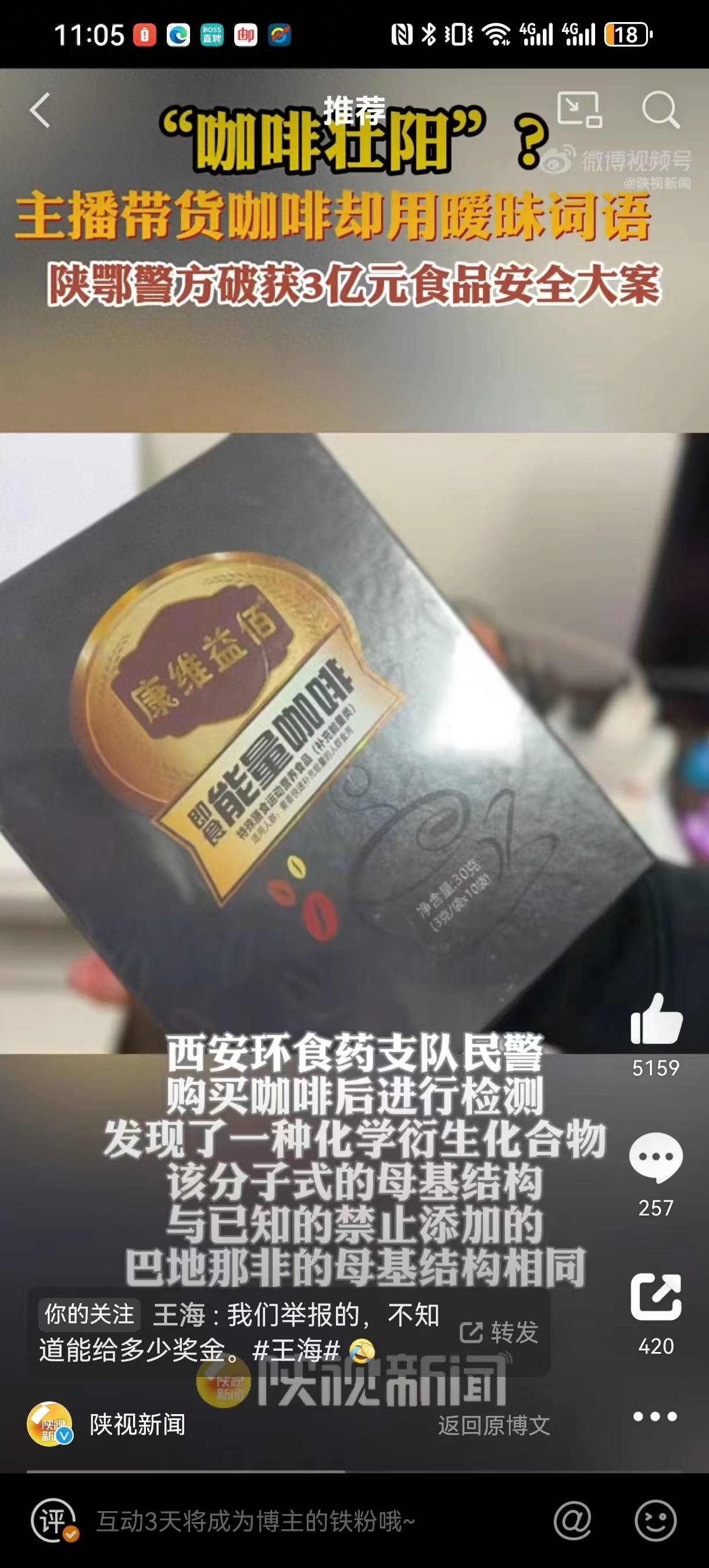10月18日,据媒体报道,有举报称主播卖咖啡用词隐晦却明确指出壮阳的效果,经西安环食药支队警方检测后发现,咖啡中添加了国家明令禁止保健品食品中添加的巴地那非衍生物。它属于第三类精神药品,有强烈的成瘾性和副作用,长期服用会导致心脏、肝脏、肾脏等器官损伤,甚至危及生命。陕西、湖北警方同时收网,抓获涉案人员98人,捣毁辐射全国22省从事销售有害有毒食品的5个窝点,半成品咖啡粉1000余公斤,涉案金额达3亿元。