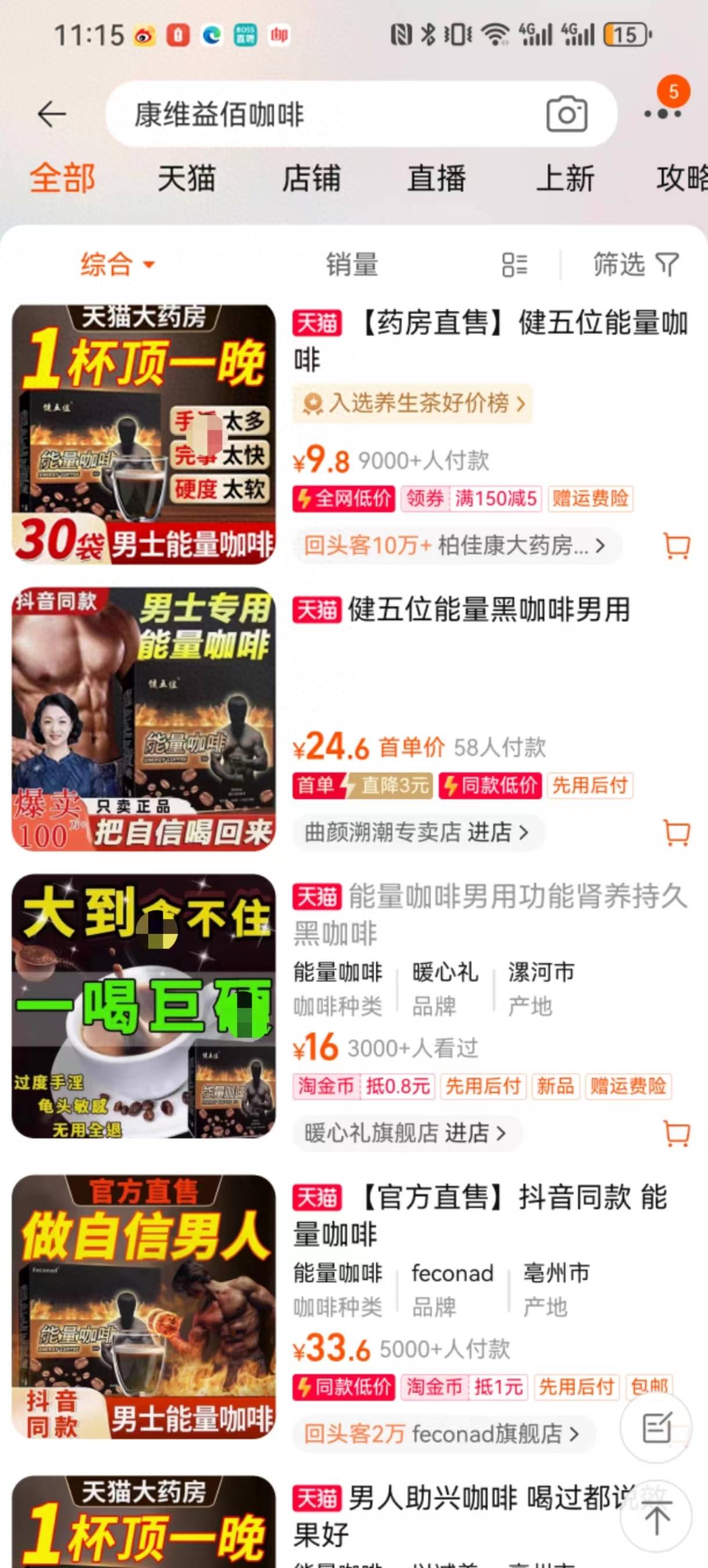 而在淘宝,雷达财经虽然未检索到康维益佰即食能量咖啡的链接,但是一些咖啡宣传有“壮阳功能”。