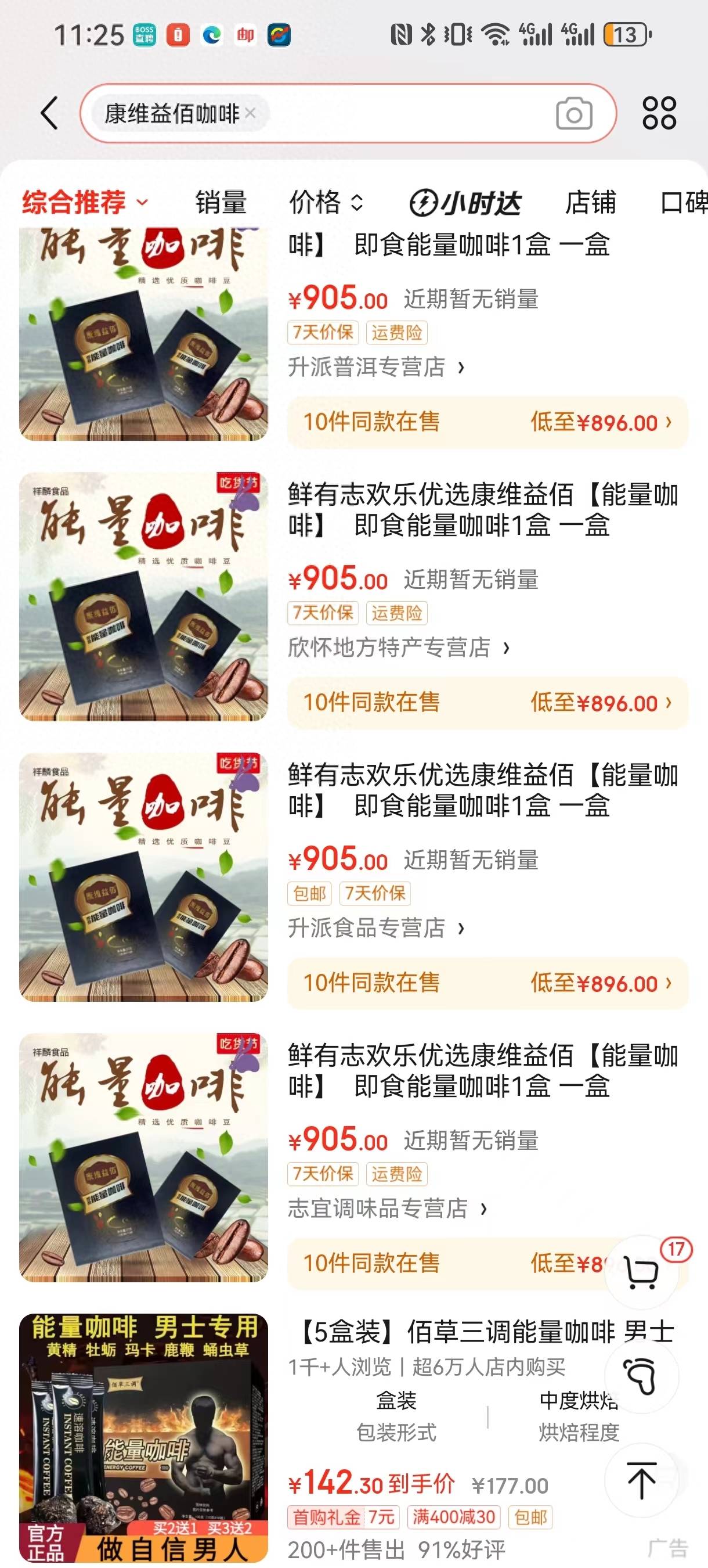 媒体发布的视频显示,该款产品名为康维益佰即食能量咖啡。雷达财经以“康维益佰咖啡”为关键词在京东检索发现,有4家店铺仍有该款产品的宣传图和报价。不过,当雷达财经以消费者身份询问时,客服表示目前处于缺货状态。