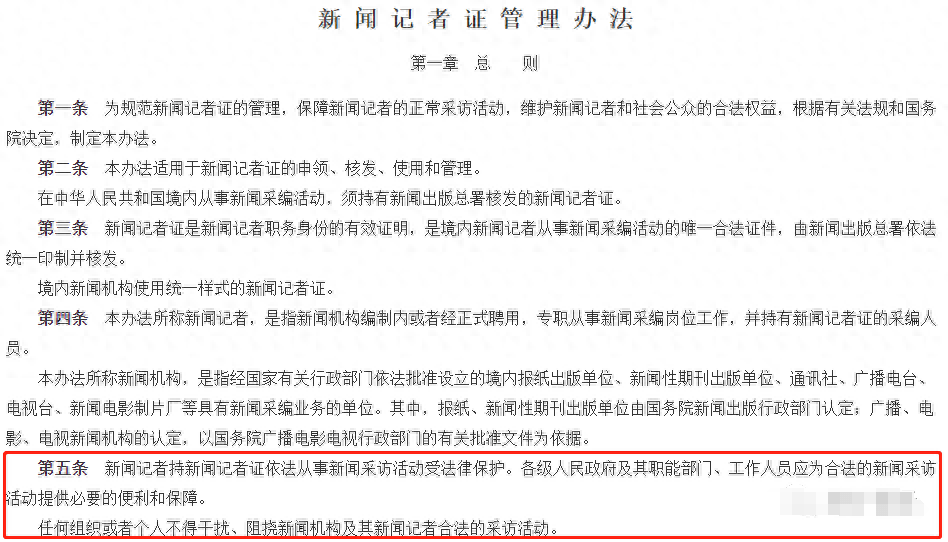 《新闻记者证管理办法》第五条规定:新闻记者持新闻记者证依法从事新闻采访活动受法律保护,各级人民政府及其职能部门、工作人员应为合法的新闻采访活动提供必要的便利和保障。