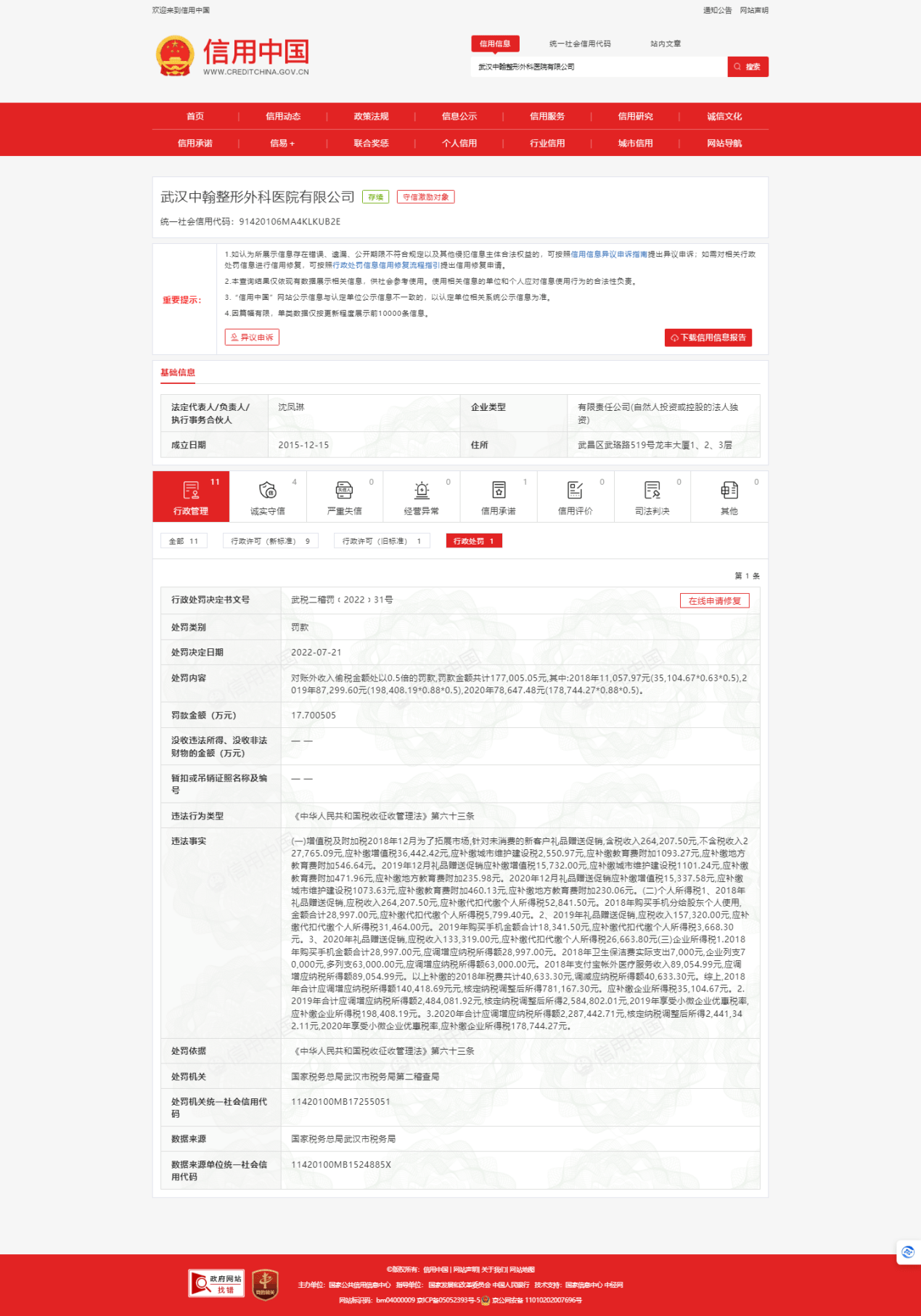 本网从《信用中国》了解到,2022年7月21日,武汉中翰整形外科医院违反了《中华人民共和国税收征收管理法》第六十三条,偷税金额高达35万元以上,被国家税务总局武汉市税务局第二稽查局对账外收入偷税金额处以0.5倍的罚款,罚款金额共计177,005.05元,行政处罚决定书文号:武税二稽罚﹝2022﹞31号。