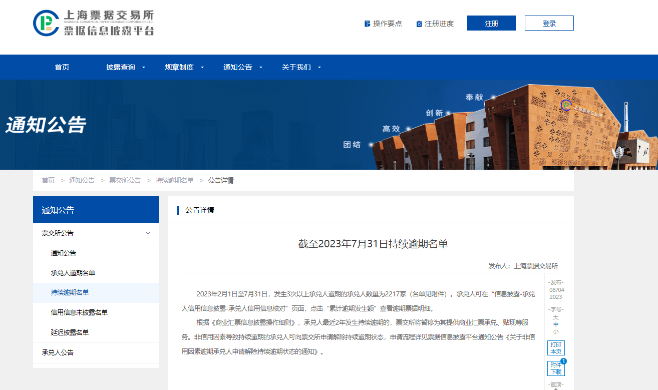 近日,上海票据交易所披露《截至2023年7月31日持续逾期名单》。2023年2月1日至7月31日,发生3次以上承兑人逾期的承兑人数量为2217家,其中包括西安建工集团有限公司。