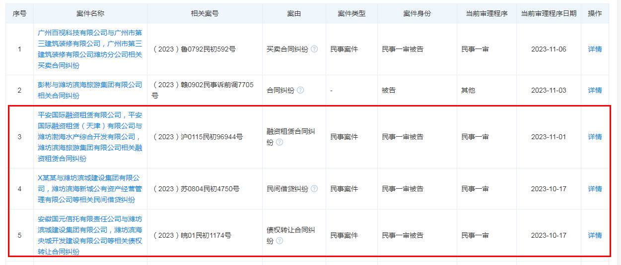 事实上,近期潍坊滨海旅游集团纠纷不断,除了国元信托、平安信托外,平安国际融资租赁公司也将于11月1日与潍坊滨海旅游集团对簿公堂,案由为融资租赁合同纠纷。