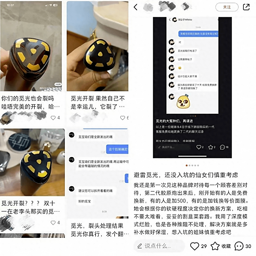 不仅如此,AMIRO觅光的品控问题也一直被诟病。社交平台上,有不少消费者质疑觅光美容仪存在虚假宣传、暗藏皮肤烫伤、重金属超标等安全隐患,投诉最多的是美容仪射频头开裂问题。很多消费者吐槽,自己买的觅光美容仪使用几次之后,射频头表面纷纷出现大小不等的裂痕甚至裂缝。
