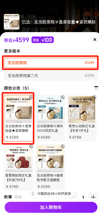 AMIRO觅光胶原炮第一代产品在京东、天猫、抖音等不同平台官方店铺预估到手价为4599,与贾乃亮、向太、琦儿等达人抖音直播间预估到手价相同。