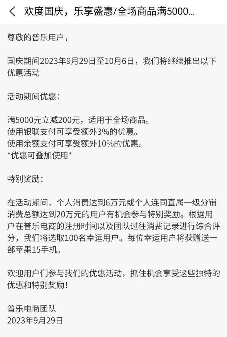 也是在这一天,普乐电商开始在APP上更新公告、点对点发送短信微信,各种渠道宣传国庆期间的促销活动:9月29日至10月6日,使用银联支付可享受额外3%的优惠,使用余额支付可享受额外10%的优惠;假期期间奖励金(手工费)提高10%;甚至个人账户下单满6万,还有机会获得一部iPhone15手机。