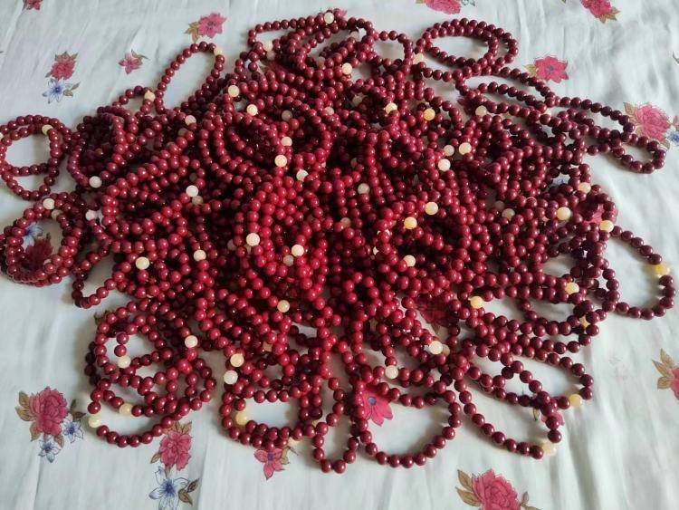 “手链材料包价格397元,能穿12个手链,一个手链穿23个珠子,22颗红色朱砂,一颗米黄玉,穿完一包能拿到45元手工费。”接受上游新闻记者采访时,曲红以极快的语速流畅地说出,她对这些早就烂熟于心。一个多月时间,她从早到晚都要和这些串珠打交道。