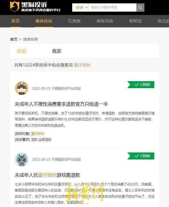 10月24日,新黄河记者从黑猫投诉平台输入“《蛋仔派对》”关键词检索发现,共有1.2万余投诉,其中大多数与未成年人充值有关。其中,未成年人年龄大多在10岁左右,有的甚至只有6岁,达不到该游戏玩家至少年龄8岁+的要求;要求退款的金额则在数百元到数千元不等,有的高达两三万元。家长们普遍反映,孩子都是在绕过实名认证登录后被游戏诱导消费,且丝毫不限制充值金额,在退款时遭遇各种障碍,与《蛋仔派对》官方客服交涉时,对方往往把责任推给游戏合作平台,有的只能退一小部分,有的一分钱都不退。