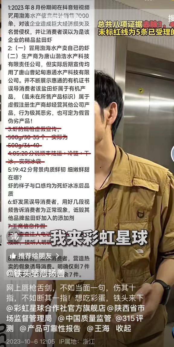 南都记者注意到,9月底至国庆假期期间,博主铁头发布多期视频,记录其投诉举报西安彩虹星球文化科技有限公司所售盐田虾的经过。视频显示,该博主前往西安,向当地市场监管部门列举8条彩虹星球违法违规销售盐田虾的行为,涉及彩虹星球盐田虾的品质及宣传问题。