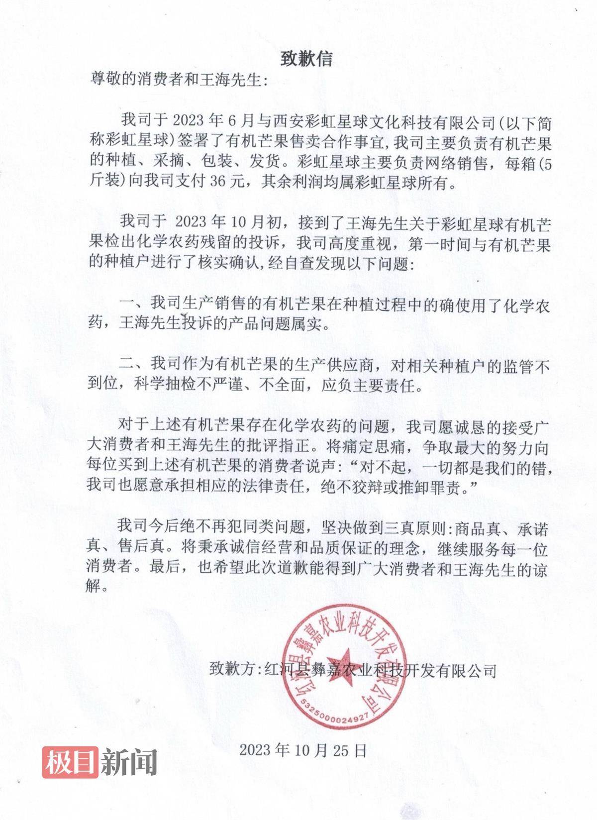 根据王海发布的一份检测报告,在对“彩虹星球”销售的芒果产品的7项检测中,有氨基蒽醌、腐霉利、吡唑醚菌酯等3项检测出有残留。除检测报告外,王海还发出了一封致歉信。这封致歉信落款为红河县彝嘉农业科技开发有限公司。