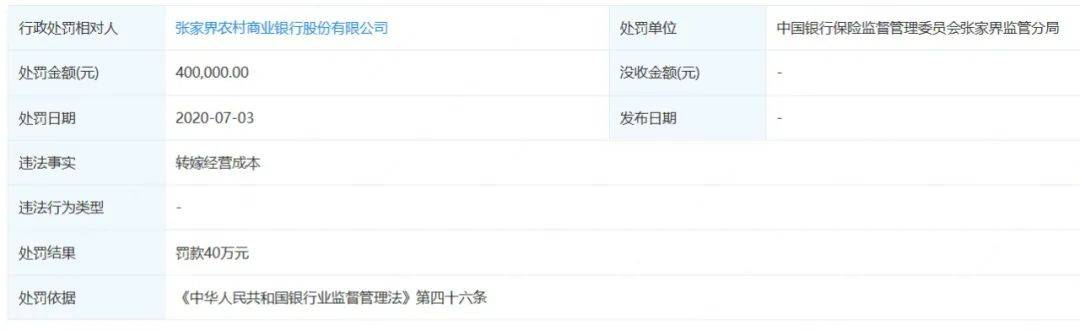2020年7月,原银保监会张家界监管分局发布的行政处罚信息显示,张家界农商行因转嫁经营成本被罚款40万元。
