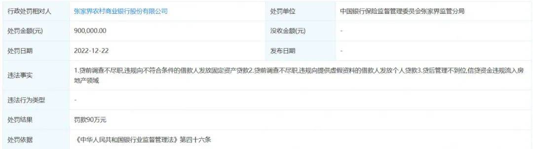 2022年12月,原银保监会张家界监管分局发布的行政处罚信息显示,张家界农商行存在三项违法事实:贷前调查不尽职,违规向不符合条件的借款人发放固定资产贷款;贷前调查不尽职,违规向提供虚假资料的借款人发放个人贷款;贷后管理不到位,信贷资金违规流入房地产领域等,被罚款90万元。
