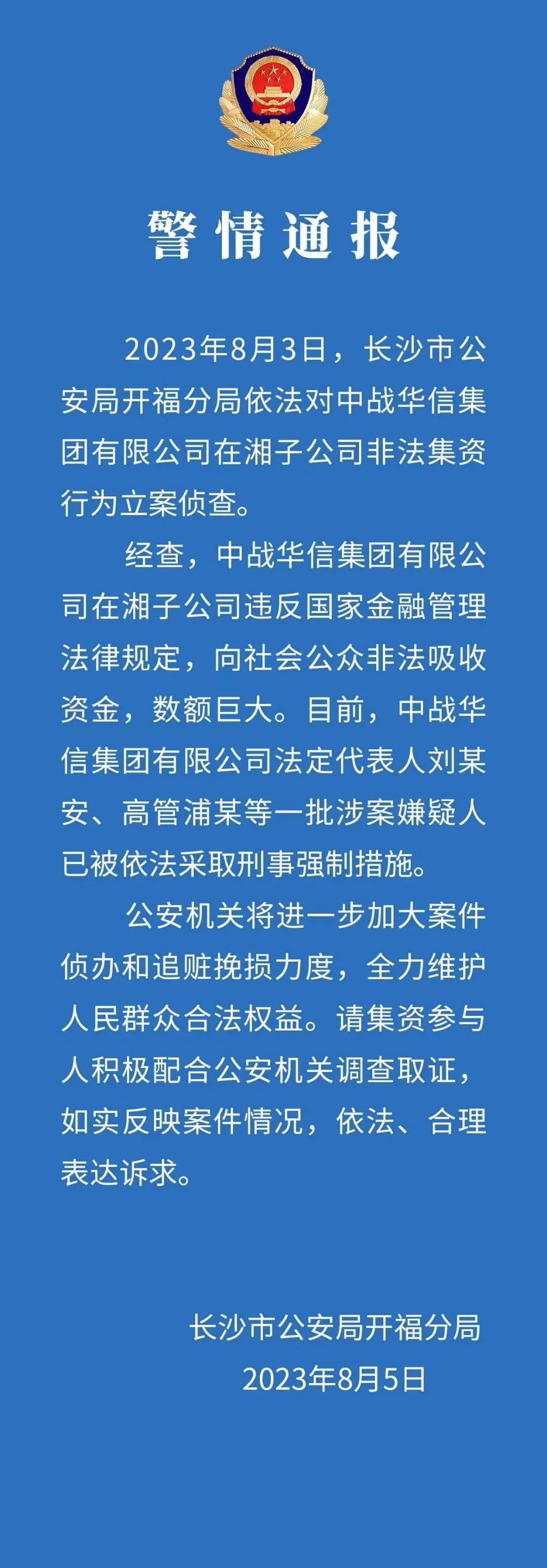 具体而言,今年8月,长沙市公安局开福分局一则警情通报显示,中战华信在湘子公司因违反国家金融管理法律规定,向社会公众非法吸收资金,数额巨大被立案侦查。中战华信集团的法定代表人刘某安、高管浦某等一批涉案嫌疑人已被依法采取刑事强制措施。