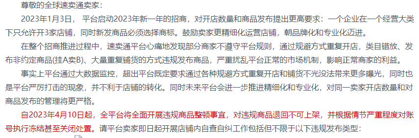 就在今年,“全球速卖通”还全面开展了商品违规发布整顿。整顿公告显示,自2023年4月10日起,全平台将全面开展违规商品整顿事宜,对违规商品退回不可上架,并根据情节严重程度对账号执行冻结甚至关闭处置。