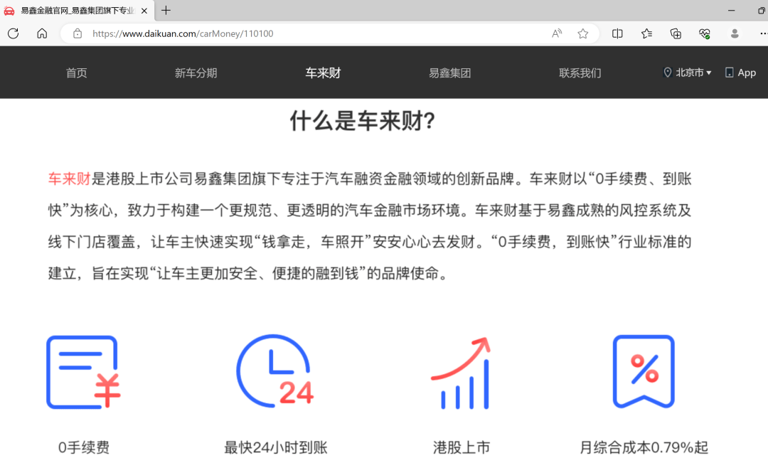 易鑫集团官网披露,车来财是易鑫集团旗下专注汽车融资的创新品牌,车来财以“0手续费、到账快”为核心,让车主快速实现“钱拿走,车照开”安安心心去发财。
