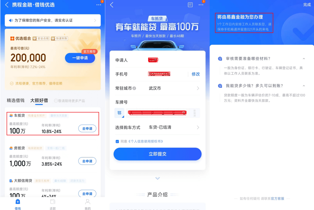 开甲财经注意到,携程金融-借钱优选(贷款超市)引流的“车抵贷”业务由易鑫金融(车来财)提供服务。根据提示,小编提交姓名、手机号、车牌号信息后,易鑫金融来电告知小编,来自携程的线索,并明确您的贷款由合作银行提供,万一没有获得银行授信,将由易鑫合作的“青岛财通”放贷。