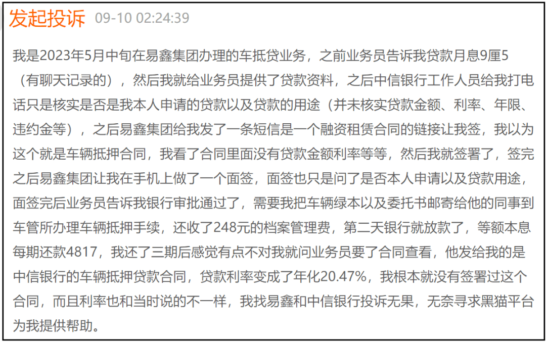 9月10日,有网友发帖反映,其2023年5月在易鑫办理车抵贷,业务员曾告知贷款月息9厘5,期间中信银行工作人员并未向其核实贷款金额、利率、年限、违约金等信息,办完贷款发现,中信银行的车抵贷合同载明贷款年利率为20.47%,本人没有签署过这个贷款合同,且合同利率与业务员说的完全不一样,本人向易鑫集团和中信反馈无果,无奈只能在黑猫平台寻求帮助。