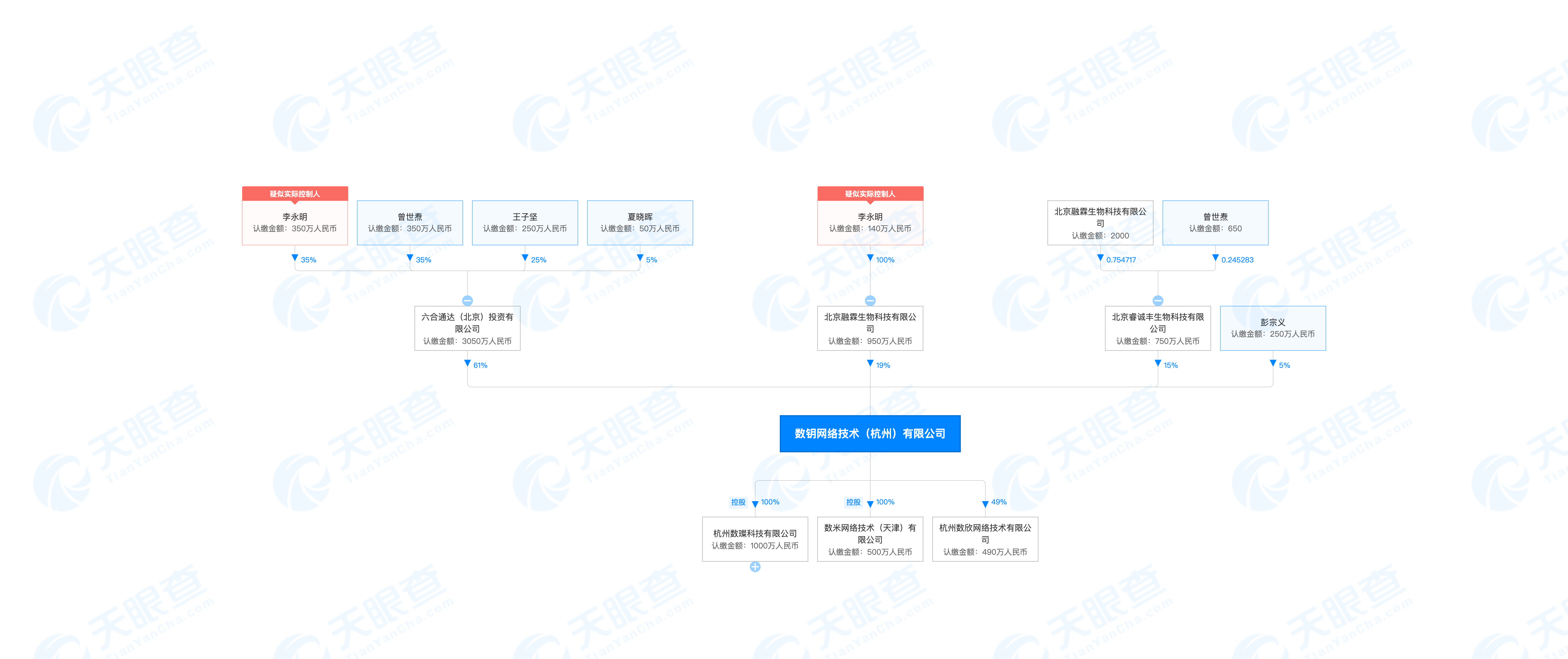 据天眼查信息显示,数钥科技成立于2019年8月,股东包括六合通达(北京)投资有限公司、北京融霖生物科技有限公司、北京睿诚丰生物科技有限公司等。穿透股权可知,李永明为数钥网络的实际控制人。