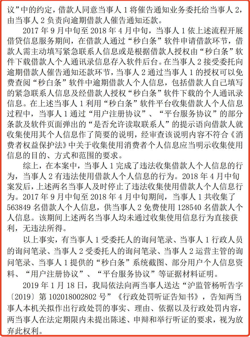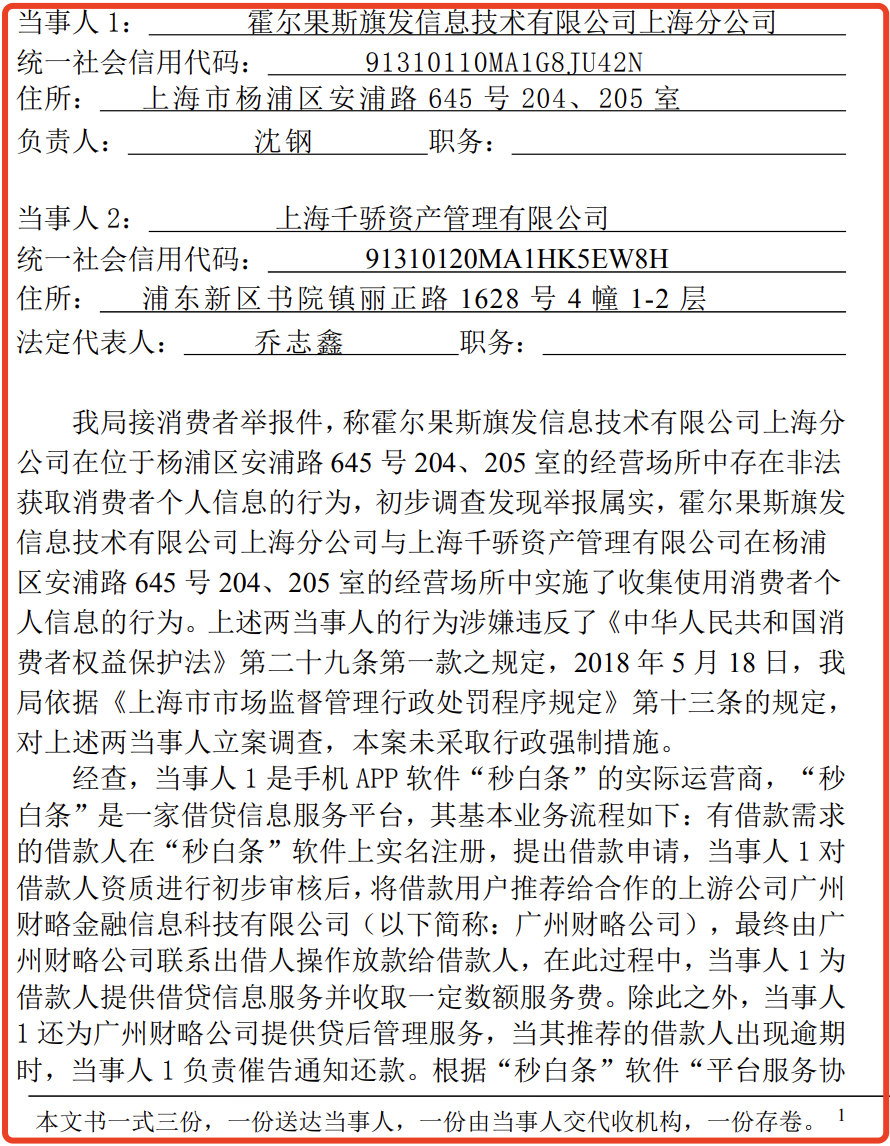 根据处罚决定书,霍尔果斯旗发信息技术有限公司上海分公司(下称“旗发信息”)在7个月的时间里,通过手机贷款超市、助贷平台“秒白条”共违规收集了563849名借款人的个人信息,供其合作方——上海千骄资产管理有限公司使用128540名借款人个人信息。