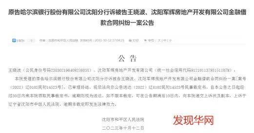 类似公开的房地产业务风险还有一些。比如沈阳市和平区法院今年10月发布的《金融借款合同纠纷一案公告》显示,哈尔滨银行沈阳分行起诉了王晓波、沈阳军辉房地产开发有限公司。工商信息显示,沈阳军辉房地产早就被列入了失信被执行人名单、限高名单。