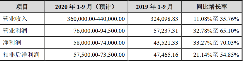 数据显示,2020年前三季度,东鹏饮料实现营业收入在36亿-44亿元之间,与去年同期32.41亿元相比,增幅在11%和36%之间;净利润在5.8亿-7.4亿元之间,相较于2019年前三季度4.35亿元,增幅在33%-70%之间。