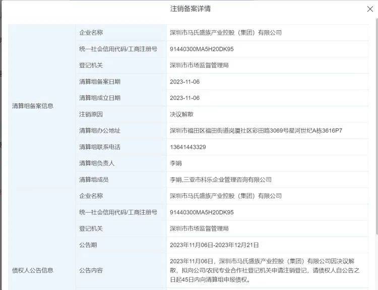 深圳市马氏盛族产业控股(集团)有限公司已于11月6日注销,她在该公司担任董事长。马小秋系鼎益丰创始人,曾任鼎益丰集团总裁,之前和隋广义等人一起成立了众多以“鼎益丰”命名的企业主体。隋广义在11月5日鼎益丰旗下元鼎集团开办的“元鼎国际全球文创生活发布盛典”中露面,而作为隋的“老搭档”,大会上并未出现马小秋的身影。