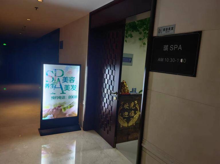 在客房电梯旁调查员找到了爆料人所说的理发店。一个简单的灯箱作为招牌。灯箱上写着SPA养生美容美发,内部预约电话。从外表看,这间酒店内的SPA养生门店与普通店面并无二致。